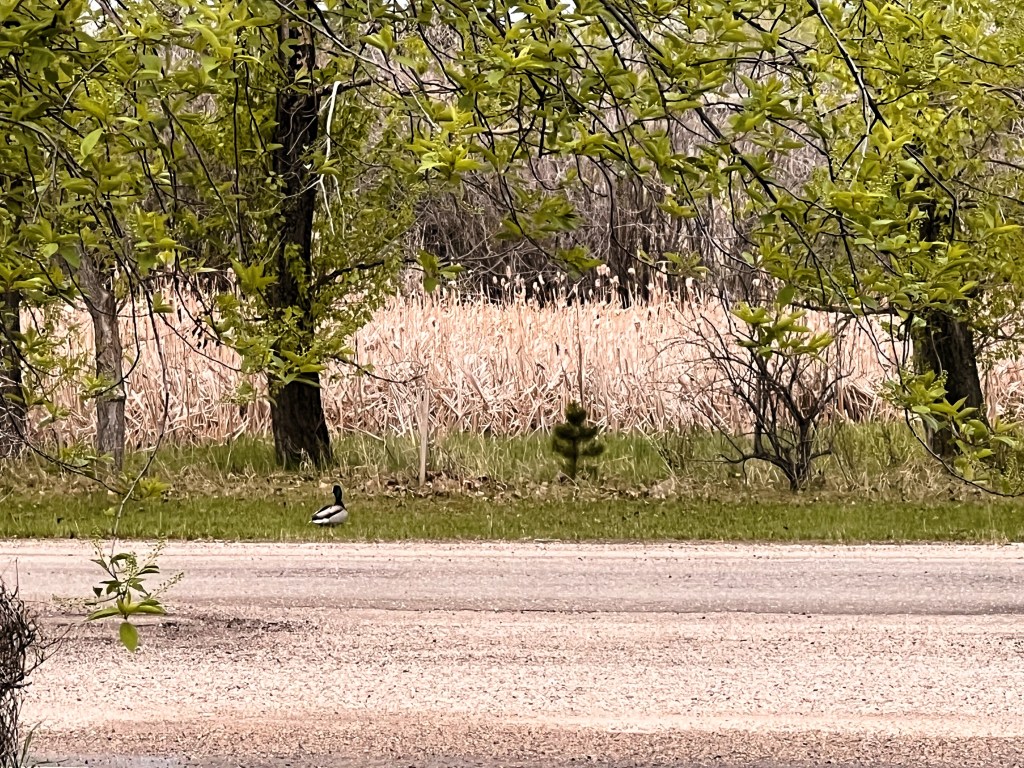 Her mate could be seen keeping an eye on her from across the road, but after a bit of time his patience wore out and he abandoned his vigil, flying back over the cattails into the pond.
